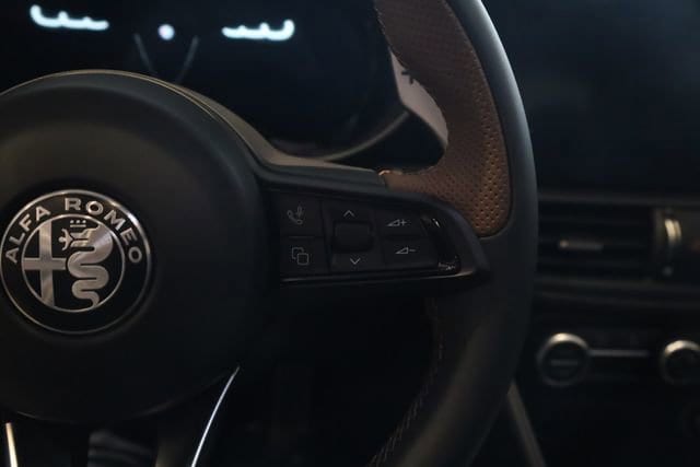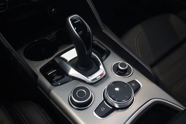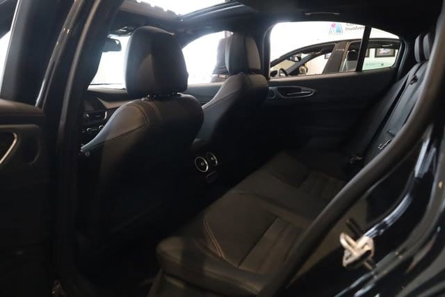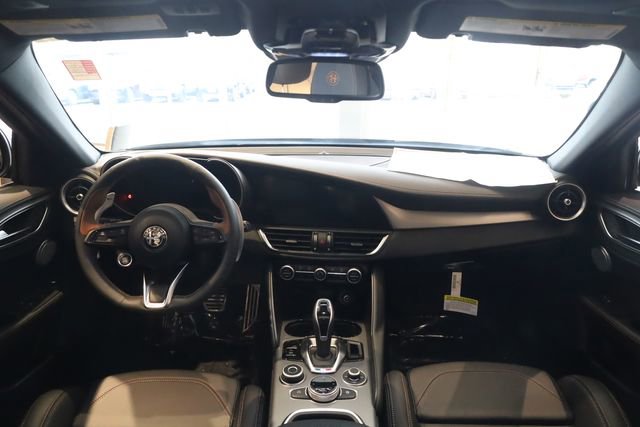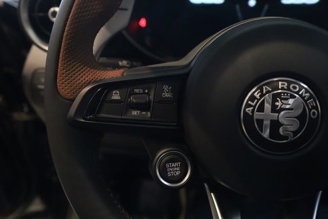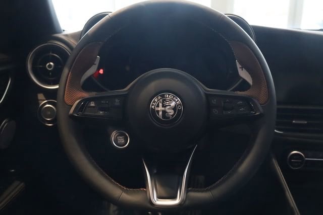 This Giulia is well equipped with Quick Order Package 22F Intensa, 14 Speakers, 4-Wheel Disc Brakes, ABS brakes, Air Conditioning, Alloy wheels, AM/FM radio: SiriusXM, Apple CarPlay/Android Auto, Auto High-beam Headlights, Auto-dimming door mirrors, Auto-dimming Rear-View mirror, Automatic temperature control, Brake assist, Bumpers: body-color, Compass, Delay-off headlights, Driver door bin, Driver vanity mirror, Dual front impact airbags, Dual front side impact airbags, Dual-Pane Sunroof, Electronic Stability Control, Exterior Parking Camera Rear, Four wheel independent suspension, Front anti-roll bar, Front Bucket Seats, Front Center Armrest, Front dual zone A/C, Front reading lights, Fully automatic headlights, Garage door transmitter, harman/kardon® Speakers, Heated door mirrors, Heated front seats, Heated rear seats, Heated steering wheel, Illuminated entry, Knee airbag, Leather Shift Knob, Leather steering wheel, Low tire pressure warning, Manufacturer's Statement of Origin, Memory seat, Navigation System, Occupant sensing airbag, Outside temperature display, Overhead airbag, Overhead console, Panic alarm, Passenger door bin, Passenger vanity mirror, Power door mirrors, Power driver seat, Power passenger seat, Power steering, Power windows, Radio data system, Radio: AM/FM/HD 8.8" w/Navigation, Rain sensing wipers, Rear anti-roll bar, Rear reading lights, Rear seat center armrest, Rear window defroster, Remote keyless entry, Security system, Speed control, Speed-sensing steering, Speed-Sensitive Wipers, Split folding rear seat, Sport Leather Seats, Sport steering wheel, Steering wheel mounted audio controls, Tachometer, Telescoping steering wheel, Tilt steering wheel, Traction control, Trip computer, Turn signal indicator mirrors, Variably intermittent wipers, Wheels: 19" x 8.5" Fr/19" x 10" Rr Black-Gold Alum, and Wheels: 19" x 8.5" Fr/19" x 10" Rr Black-Gold Sport.