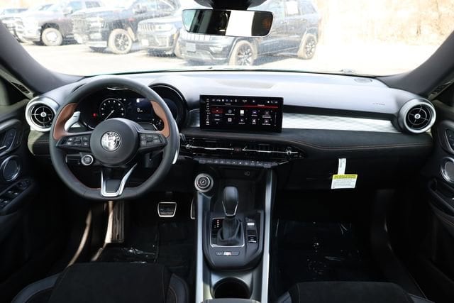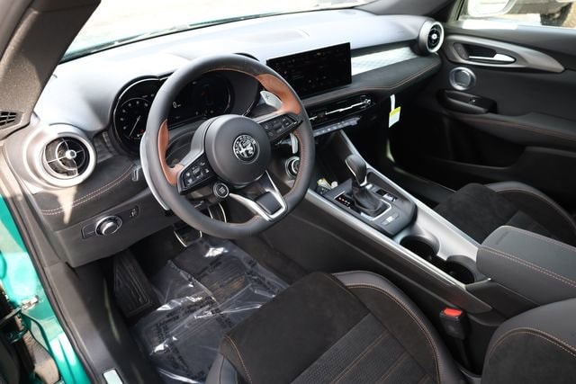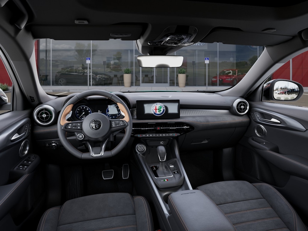This Tonale is well equipped with Ambient Lighting Package, Quick Order Package 23F Intensa (Aluminum Steering Column Mounted Paddle Shifters, Auto-Dimming Rear Exterior Mirrors, Calipers Black w/Gold Script, Driver Seat Memory, Gloss Black Painted DLO, Hands Free Power Liftgate, harman/kardon Premium Audio, Leather Wrapped Steering Wheel, ParkSense Front/Rear/Side Park Assist, Perforated Alcantara Seat, Power Liftgate, Power Moonroof, Surround View Camera System, Veloce Aluminum Door Sills, and Wheels: 20" x 8.0" Black-Gold Aluminum), 1 Additional Key Fob, 4-Wheel Disc Brakes, 6 Speakers, ABS brakes, Air Conditioning, Alloy wheels, AM/FM radio: SiriusXM, Anti-whiplash front head restraints, Apple CarPlay/Android Auto, Auto High-beam Headlights, Auto-dimming Rear-View mirror, Automatic temperature control, Brake assist, Bumpers: body-color, Compass, Delay-off headlights, Driver door bin, Driver vanity mirror, Dual front impact airbags, Dual front side impact airbags, Electronic Stability Control, Emergency communication system, Four wheel independent suspension, Front anti-roll bar, Front Bucket Seats, Front Center Armrest w/Storage, Front dual zone A/C, Front fog lights, Front reading lights, Fully automatic headlights, Garage door transmitter, Heated door mirrors, Heated front seats, Heated steering wheel, Illuminated entry, Knee airbag, Leather steering wheel, Low tire pressure warning, Manufacturer's Statement of Origin, Navigation System, Occupant sensing airbag, Outside temperature display, Overhead airbag, Overhead console, Panic alarm, ParkView Rear Back-Up Camera, Passenger door bin, Passenger vanity mirror, Power door mirrors, Power driver seat, Power passenger seat, Power steering, Power windows, Radio: Uconnect 5 Nav w/10.25" Display, Rain sensing wipers, Rear anti-roll bar, Rear seat center armrest, Rear window defroster, Rear window wiper, Remote keyless entry, Security system, Speed control, Split folding rear seat, Spoiler, Sport Cloth Seat w/Biscotto Stitch, Sport steering wheel, Steering wheel mounted audio controls, Tachometer, Telescoping steering wheel, Tilt steering wheel, Traction control, Trip computer, Turn signal indicator mirrors, Variably intermittent wipers, and Wheels: 18" x 7.5" Black Diamond Cut.