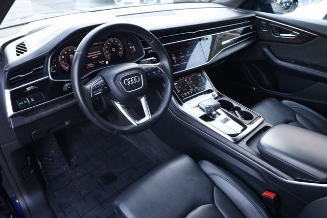 This Q8 is well equipped with Adaptive Chassis Package (4-Wheel-Steering and Adaptive Air Suspension), Cold Weather Package (Heated Rear Seats and Heated Steering Wheel), Contour/Ambient LED Interior Lighting Package, Convenience Package (Audi Phone Box w/Wireless Charging, Audi Side Assist w/Rear Cross Traffic Assist, and Heated Auto-Dimming Power Folding Exterior Mirrors), Driver Assistance Package (Audi Active Lane Departure Warning, Audi Adaptive Cruise Assist, and Traffic Sign Recognition), Extended Leather Package, Luxury Package (Dual Pane Acoustic Glass, Individual Contour Front Seats, Ionizer & Fragrance Premium Air Quality, Light Alcantara Headliner, and Valcona Leather Seat Trim), Prestige Package (21" 5-Segment-Spoke-Design Wheels, 4-Zone Climate Control, Alu Touch-Sensitive Interior Buttons, Bang & Olufsen 3D Premium Sound System, Driver & Passenger Front Seats w/Ventilation, Electric Sun Blinds for Rear Side Windows, HD Matrix-Design LED Headlights, Head-Up Display, Headlight Washers, Illuminated Door Sills & Aluminum Inlays, Power Soft-Closing Doors, Top View Camera System, and Upper Dashboard in Leather w/Stitching), S line Plus Package (Red Painted Brake Calipers and Wheels: 22" Audi Sport 5-V-Spoke Star Design), S line Style Package (S line Fender Badges, S line Illuminated Door Sills, and Wheels: 21" 5-W-Spoke-Design), S-Line Exterior Package (S line Front & Rear Bumpers and S line Side Sills), 10 Speakers, 4-Wheel Disc Brakes, ABS brakes, Adaptive suspension, Air Conditioning, Alloy wheels, AM/FM radio: SiriusXM, Audi Guard Protection Kit, Audi smartphone interface (Apple CarPlay/Android Auto), Auto High-beam Headlights, Auto-dimming Rear-View mirror, Automatic temperature control, Axle Ratio: TBA, Black Alcantara Headliner, Black Front & Rear Bumpers, Black Roof Rails & Mask, Brake assist, Bumpers: body-color, Collapsible Fabric Audi Trunk Cargo Storage Box, Compass, Delay-off headlights, Driver door bin, Driver vanity mirror, Dual front impact airbags, Dual front side impact airbags, Electronic Stability Control, Emergency communication system: Audi connect CARE, PRIME & PLUS, Exterior Parking Camera Rear, Four wheel independent suspension, Front anti-roll bar, Front Bucket Seats, Front Center Armrest, Front dual zone A/C, Front fog lights, Front reading lights, Fully automatic headlights, Garage door transmitter: HomeLink, Genuine wood door panel insert, Heated door mirr