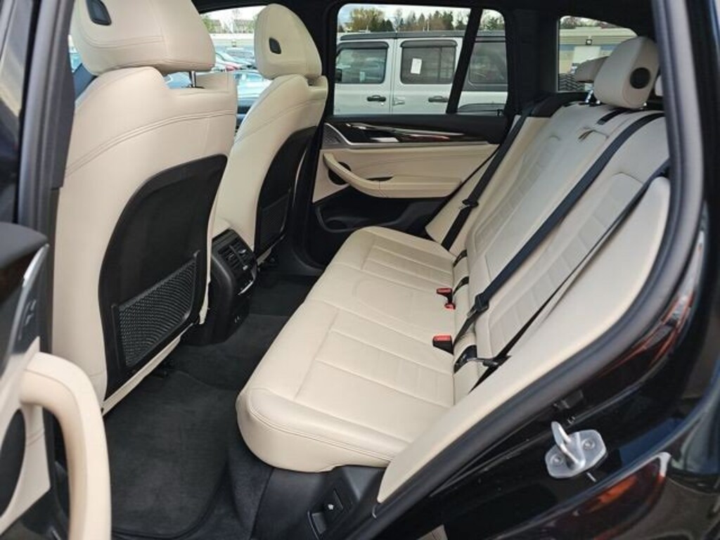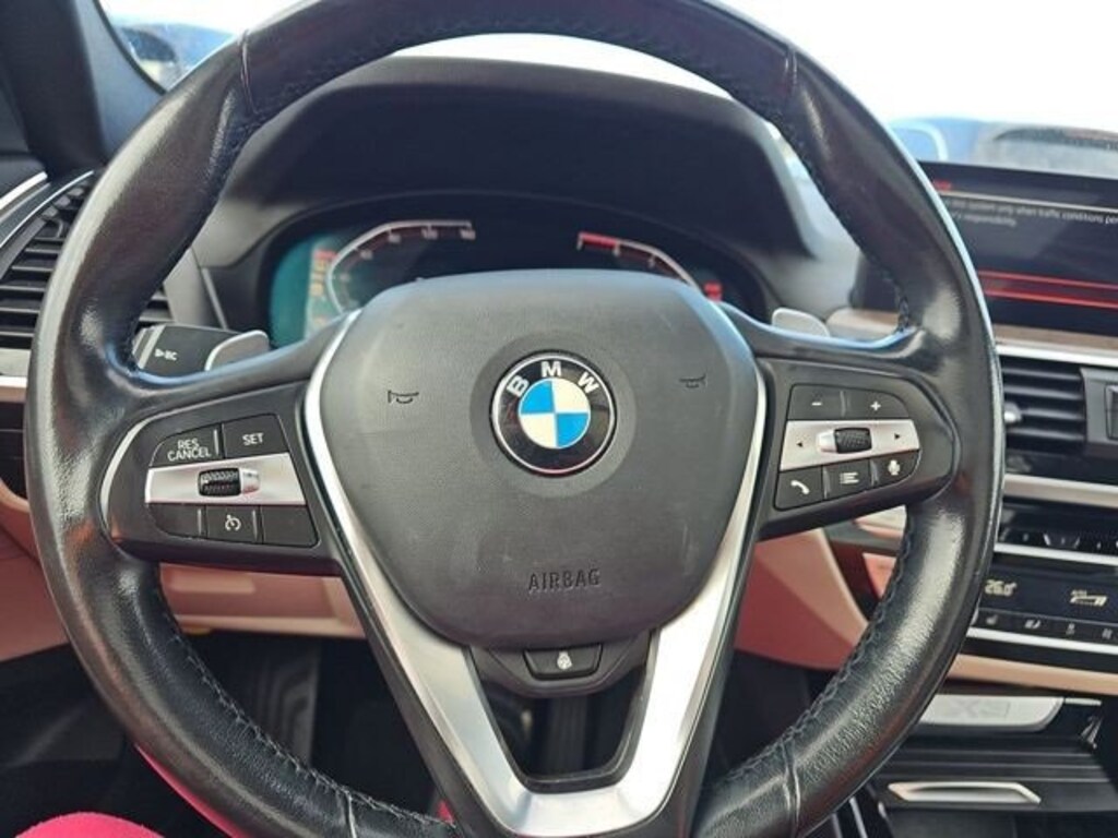 This X3 is well equipped with Connected Package Plus, Connected Package Pro, Driving Assistance Package (Active Blind Spot Detection, Active Driving Assistant, and Lane Departure Warning System), Premium Package (Head-Up Display, Heated Front Seats, Heated Steering Wheel, Live Cockpit Pro w/Navigation, Panoramic Moonroof, and SiriusXM Satellite Radio), 12 Speakers, 3.385 Axle Ratio, 4-Wheel Disc Brakes, ABS brakes, Air Conditioning, Alloy wheels, AM/FM radio, Apple CarPlay Compatibility, Apple CarPlay Compatibility with 1-year trial, Auto-dimming door mirrors, Auto-dimming Rear-View mirror, Automatic temperature control, BMW Assist eCall, BMW TeleServices, Brake assist, Bumpers: body-color, Comfort Access Keyless Entry, ConnectedDrive Services, Delay-off headlights, Driver door bin, Driver vanity mirror, Dual front impact airbags, Dual front side impact airbags, DVD Area Coding (North America), Electronic Stability Control, Emergency communication system: BMW Assist eCall, Exterior Parking Camera Rear, Four wheel independent suspension, Front anti-roll bar, Front Bucket Seats, Front Center Armrest, Front dual zone A/C, Front fog lights, Front reading lights, Fully automatic headlights, Garage door transmitter, Genuine wood dashboard insert, Genuine wood door panel insert, Hands-Free Bluetooth & USB Audio Connection, Heated door mirrors, Hi-Fi Sound System, Illuminated entry, Knee airbag, Low tire pressure warning, Lumbar Support, Memory seat, Navigation, Navigation System, Occupant sensing airbag, Outside temperature display, Overhead airbag, Panic alarm, Passenger door bin, Passenger vanity mirror, Power door mirrors, Power driver seat, Power Front Seats, Power Liftgate, Power passenger seat, Power steering, Power windows, Radio Control US, Radio data system, Radio: AM/FM Stereo w/HD, Rain sensing wipers, Rear air conditioning, Rear anti-roll bar, Rear reading lights, Rear seat center armrest, Rear window defroster, Rear window wiper, Remote keyless entry, Roof rack: rails only, Security system, SensaTec Upholstery, Speed control, Speed-sensing steering, Speed-Sensitive Wipers, Split folding rear seat, Spoiler, Sport Bucket Seats, Sport steering wheel, Steering wheel mounted audio controls, Tachometer, Telescoping steering wheel, Tilt steering wheel, Traction control, Trip computer, Turn signal indicator mirrors, Variably intermittent wipers, Wheels: 18" x 7.0" Y-Spoke (Style 688), and Wheels: 19" x 7.5" Y-Spoke (Style 693).