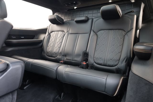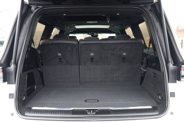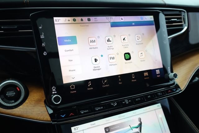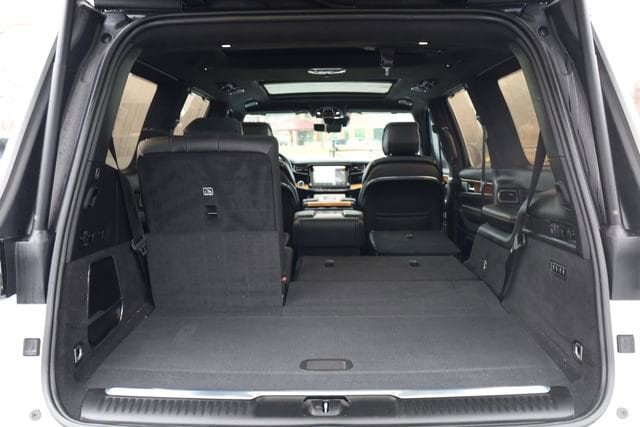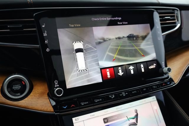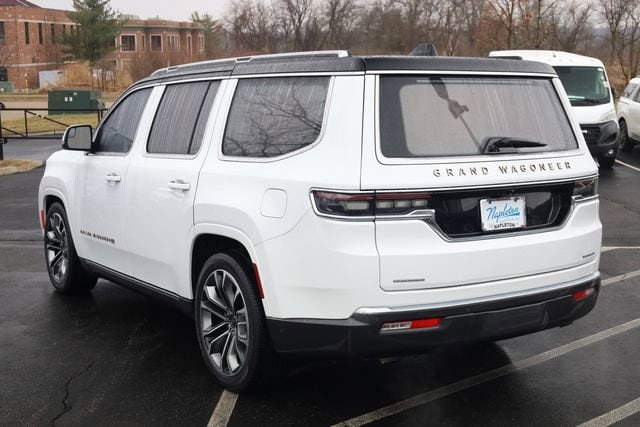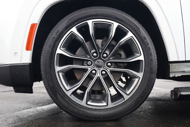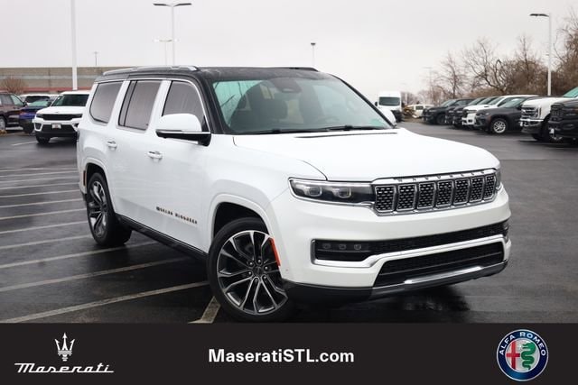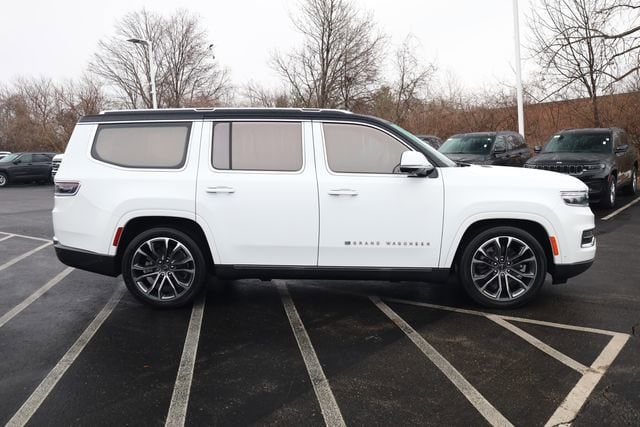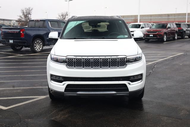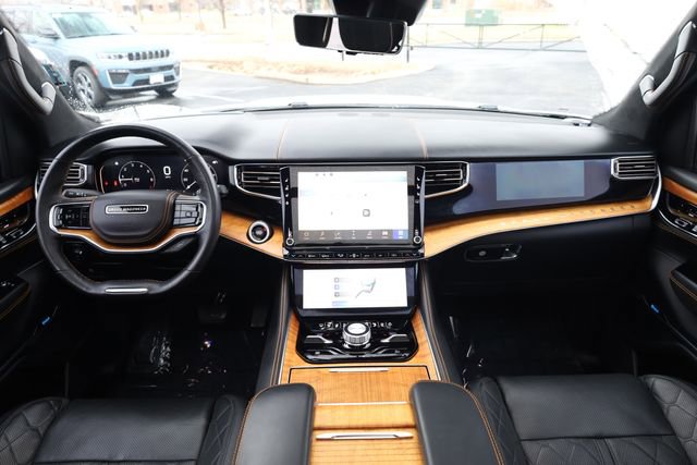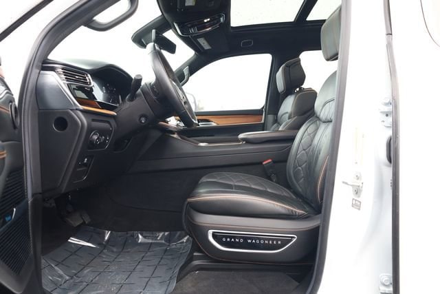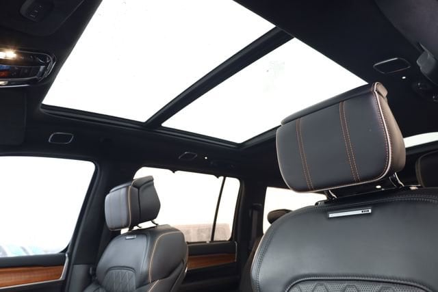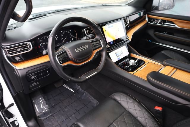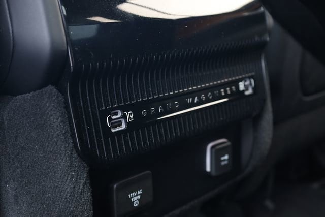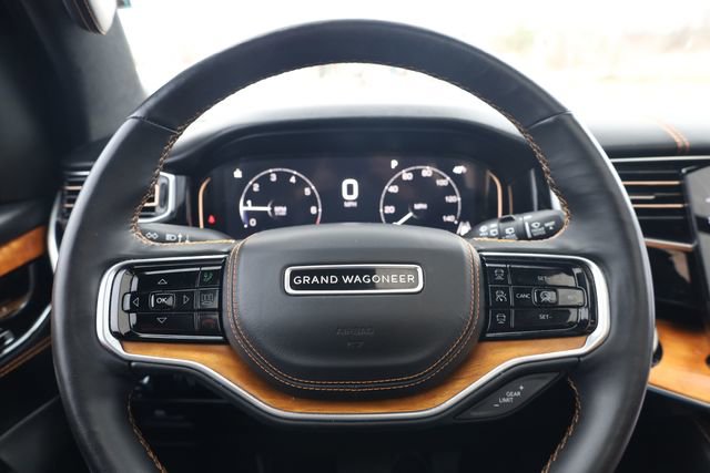 This Grand Wagoneer is well equipped with Quick Order Package 23W, Two Tone Paint Group, 3.92 Rear Axle Ratio, 3rd row seats: bench, 4-Wheel Disc Brakes, ABS brakes, Adjustable pedals, Air Conditioning, Alloy wheels, AM/FM radio: SiriusXM with 360L, Anti-whiplash front head restraints, Audio memory, Auto High-beam Headlights, Auto-dimming door mirrors, Auto-dimming Rear-View mirror, Auto-leveling suspension, Automatic temperature control, Brake assist, Bumpers: body-color, Compass, Delay-off headlights, Driver door bin, Driver vanity mirror, Driver's Seat Mounted Armrest, Dual front impact airbags, Dual front side impact airbags, Electronic Stability Control, Four wheel independent suspension, Front anti-roll bar, Front Bucket Seats, Front Center Armrest w/Storage, Front dual zone A/C, Front fog lights, Front reading lights, Fully automatic headlights, Garage door transmitter, Genuine wood console insert, Genuine wood dashboard insert, Genuine wood door panel insert, Heads-Up Display, Heated door mirrors, Heated front seats, Heated rear seats, Heated steering wheel, Illuminated entry, Knee airbag, Leather steering wheel, Low tire pressure warning, Memory seat, Navigation System, Night vision lights, Normal Duty Suspension, Occupant sensing airbag, Outside temperature display, Overhead airbag, Overhead console, Panic alarm, Passenger door bin, Passenger seat mounted armrest, Passenger vanity mirror, Pedal memory, Power adjustable front head restraints, Power door mirrors, Power driver seat, Power Liftgate, Power moonroof, Power passenger seat, Power steering, Power windows, Premium Leather Trimmed Bucket Seats, Radio data system, Radio: Uconnect 5 Nav w/12.0" Display, Rain sensing wipers, Rear air conditioning, Rear anti-roll bar, Rear dual zone A/C, Rear reading lights, Rear seat center armrest, Rear window defroster, Rear window wiper, Reclining 3rd row seat, Remote keyless entry, Roof rack, Security system, Speed control, Speed-sensing steering, Speed-Sensitive Wipers, Split folding rear seat, Steering wheel memory, Steering wheel mounted audio controls, Tachometer, Telescoping steering wheel, Tilt steering wheel, Traction control, Trip computer, Turn signal indicator mirrors, Variably intermittent wipers, Ventilated front seats, Ventilated rear seats, Voltmeter, Wheels: 22" x 9.0" Painted Aluminum, and Wheels: 22" x 9.0" Premium 4 Aluminum.