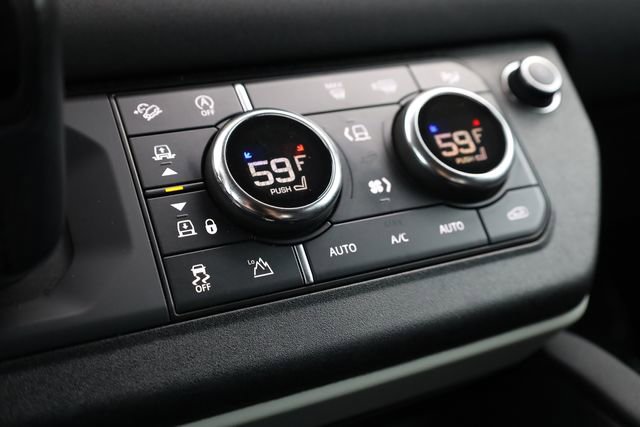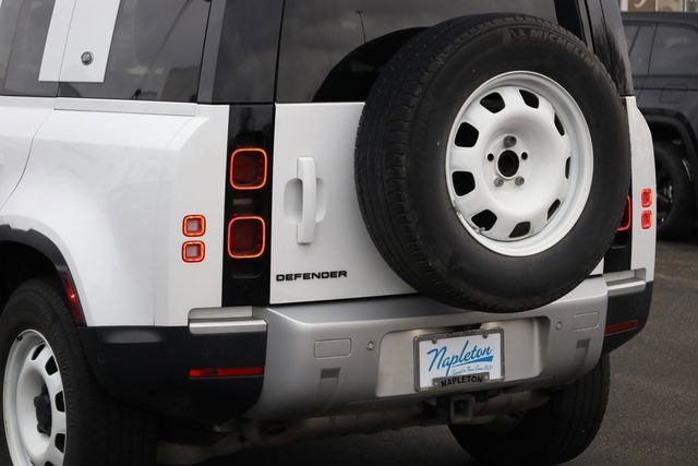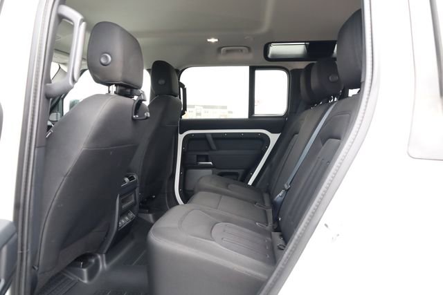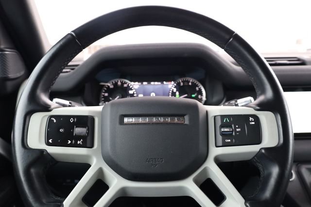 This Defender 110 is well equipped with Apple CarPlay & Android Auto, 4-Wheel Disc Brakes, 4.1 Axle Ratio, 6 Speakers, 8-Way Semi-Powered Seats, ABS brakes, Adaptive suspension, Air Conditioning, AM/FM radio: SiriusXM, Auto-dimming door mirrors, Auto-dimming Rear-View mirror, Automatic temperature control, Brake assist, Bumpers: body-color, Compass, Delay-off headlights, Driver door bin, Driver vanity mirror, Dual front impact airbags, Dual front side impact airbags, Electronic Stability Control, Fabric Seat Trim, Four wheel independent suspension, Front anti-roll bar, Front Bucket Seats, Front Center Armrest, Front dual zone A/C, Front reading lights, Fully automatic headlights, Garage door transmitter: HomeLink, Heated door mirrors, Illuminated entry, Leather Shift Knob, Leather steering wheel, Low tire pressure warning, Navigation system: Connected Navigation PIVI Pro, Occupant sensing airbag, Outside temperature display, Overhead airbag, Overhead console, Panic alarm, Passenger door bin, Passenger vanity mirror, Power door mirrors, Power driver seat, Power passenger seat, Power steering, Power windows, Radio data system, Radio: 180W 6 Speaker Sound System, Rain sensing wipers, Rear anti-roll bar, Rear fog lights, Rear reading lights, Rear window defroster, Rear window wiper, Remote keyless entry, Roof rack: rails only, Security system, Speed control, Speed-sensing steering, Speed-Sensitive Wipers, Split folding rear seat, Steering wheel mounted audio controls, Tachometer, Telescoping steering wheel, Tilt steering wheel, Traction control, Trip computer, Variably intermittent wipers, Weather band radio, and Wheels: 18" Steel Style 5093.