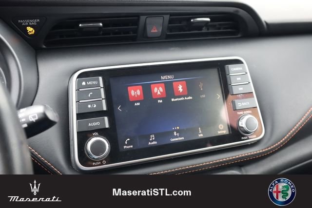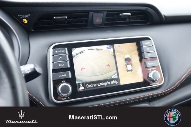 This Kicks is well equipped with SR Premium Package (Bose Personal Plus Audio System, Heated Front Seats, Prima-Tex Appointed Seat Trim, and Security System), 17" Alloy Wheels, 3.927 Axle Ratio, 6 Speakers, ABS brakes, Air Conditioning, Alloy wheels, AM/FM radio: SiriusXM, Auto High-beam Headlights, Automatic temperature control, Blind Spot Warning, Brake assist, Bumpers: body-color, Carpeted Floor Mats w/Cargo Mat, Cloth Seat Trim, Compass, Delay-off headlights, Door Sill Plates (DISC), Driver door bin, Driver vanity mirror, Driver's Seat Mounted Armrest, Dual front impact airbags, Dual front side impact airbags, Electronic Stability Control, Exterior Parking Camera Rear, Front anti-roll bar, Front Bucket Seats, Front fog lights, Front reading lights, Front wheel independent suspension, Fully automatic headlights, Heated door mirrors, Illuminated entry, Knee airbag, Leather Shift Knob, Low tire pressure warning, NissanConnect featuring Apple CarPlay and Android Auto, Occupant sensing airbag, Outside temperature display, Overhead airbag, Panic alarm, Passenger door bin, Passenger vanity mirror, Power door mirrors, Power steering, Power windows, Radio data system, Radio: AM/FM Audio System, Rear Parking Sensors, Rear reading lights, Rear Roof Spoiler, Rear side impact airbag, Rear window defroster, Rear window wiper, Remote keyless entry, Roof rack: rails only, Speed control, Splash Guards Grain (4 Piece), Split folding rear seat, Spoiler, Sport steering wheel, Steering wheel mounted audio controls, Tachometer, Telescoping steering wheel, Tilt steering wheel, Traction control, Trip computer, Turn signal indicator mirrors, and Variably intermittent wipers.